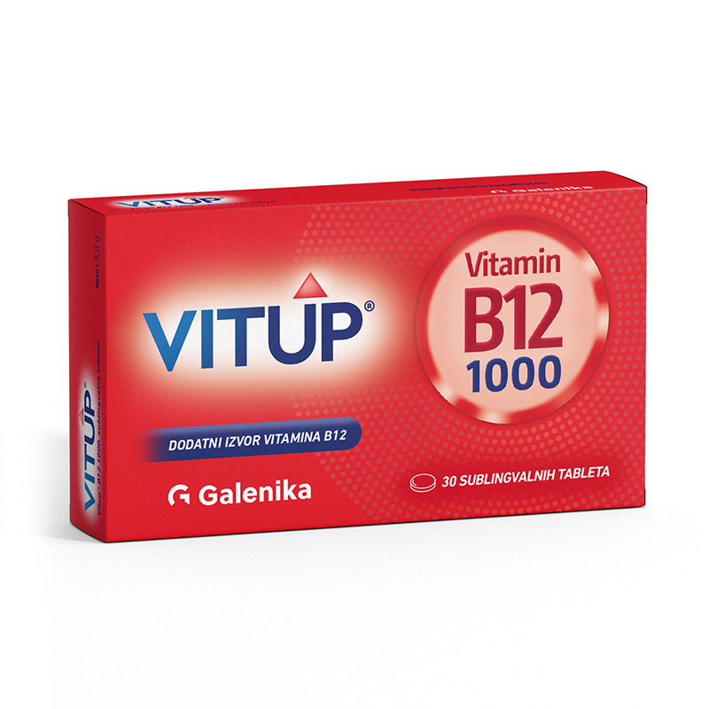Vitup® B12 1000 je dodatak ishrani sa zaslađivačem i predstavlja dodatni izvor vitamina B12 kojinmogu koristiti odrasli i deca starija od 12 godina.nNamenjen je starijim osobama, sportistima i osobama koje se osećaju umorno i iscrpljeno.